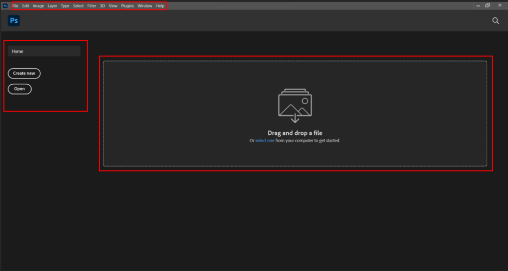 इसमें आपको ऊपर में मेनू बार दिखेगा, उसके बाद आपको फोटोशोप का एक लोगो दिखेगा | लोगो के निचे आपको दो बटन दिखेंगे |