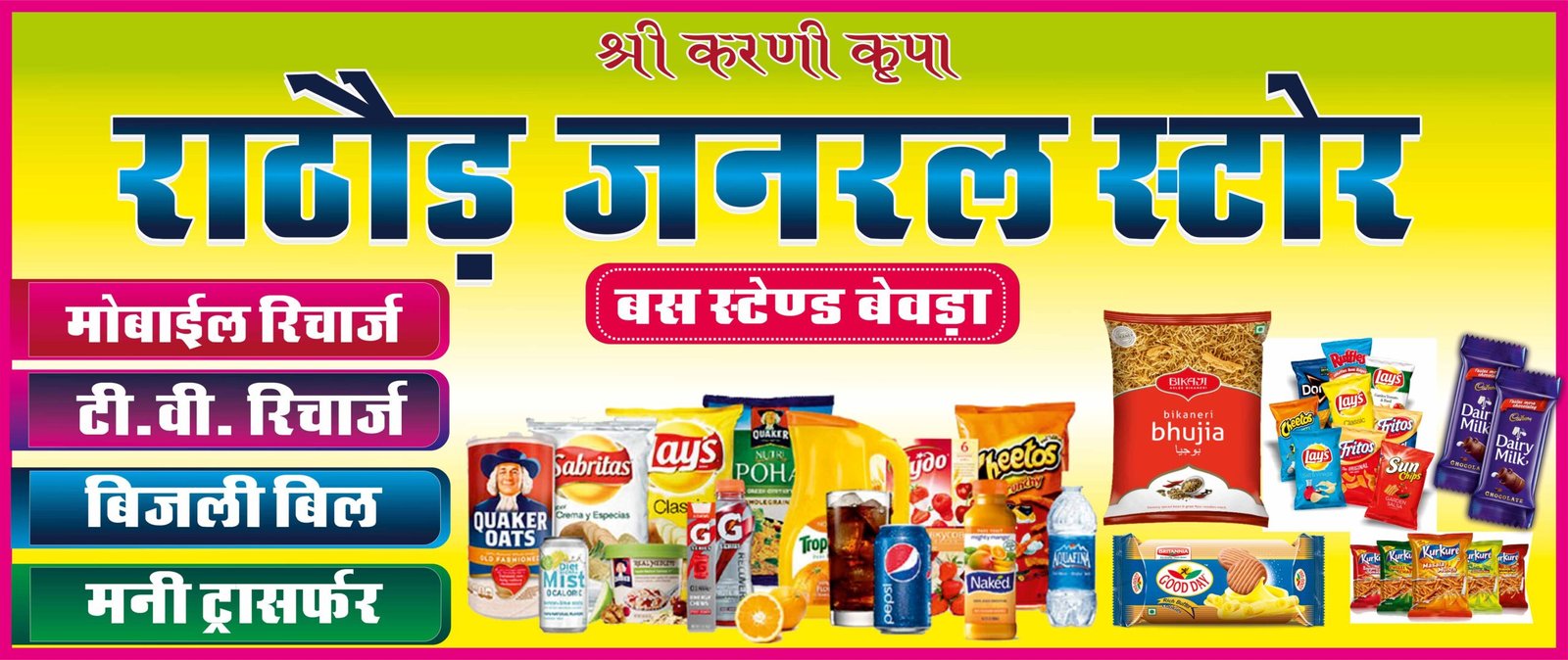 This Kirana Store Banner Design is available in high-resolution print-ready format, suitable for flex printing, shop front display, and outdoor advertising.